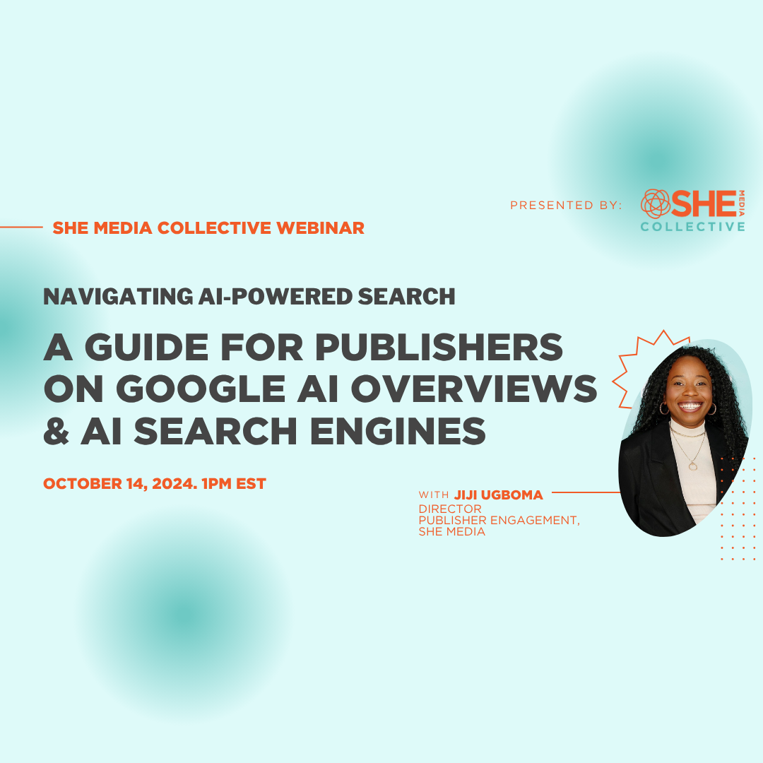 The Search landscape is evolving fast. Google AI Overviews (AIO), AI Mode, and AI Search engines like Chat GPT and Perplexity are changing how publishers and their content show up on the web and how they reach audiences. For publishers, that means more opportunities and more risk: - Fewer clicks due to “zero-click” results - Increased competition to be featured inside AI summaries - Need for content structure, clarity, and branding that works for human readers and machine summarization In the SHE Media Collective Q4 webinar, SHE Media Director of Publisher Partnerships & Engagement Jiji Ugboma discusses how AI trends impact publishers and equips you with the insights and tools you need to keep your audience and traffic growing despite AI changes.